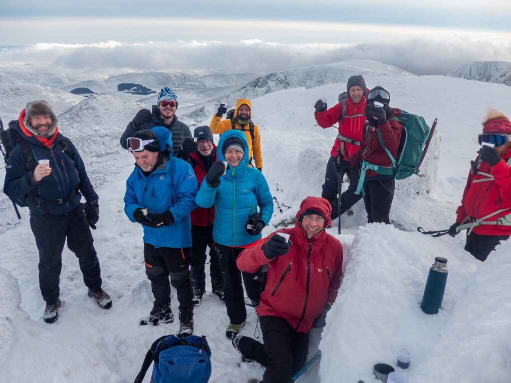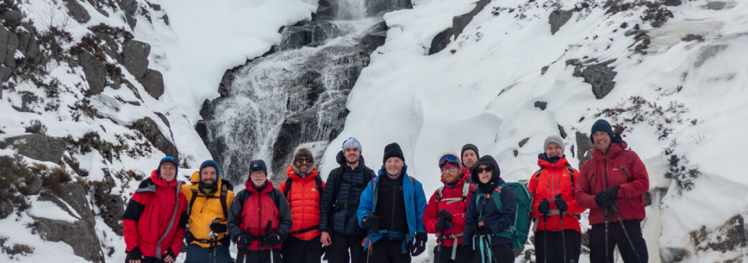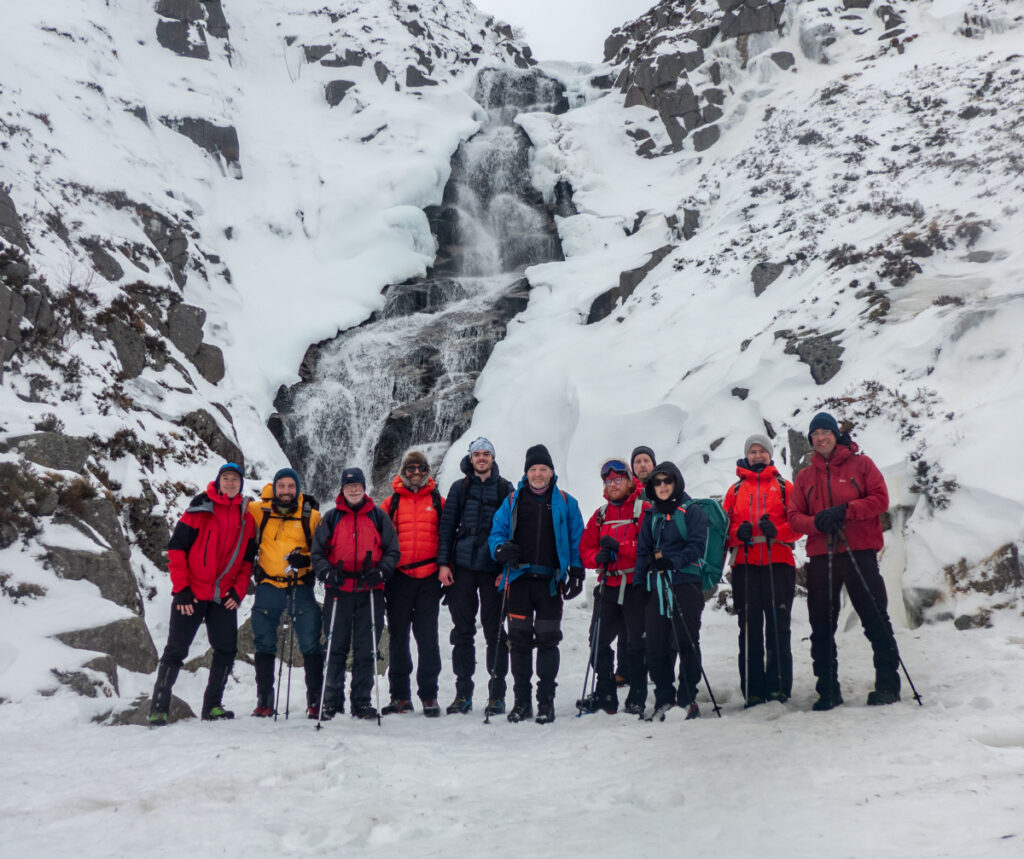 After summitting and enjoying some mulled wine, we had an unexpected stop beside the Glas Allt falls, which having frozen across at the base due to an extended cold spell, allowed for an unusual group photo standing directly below.