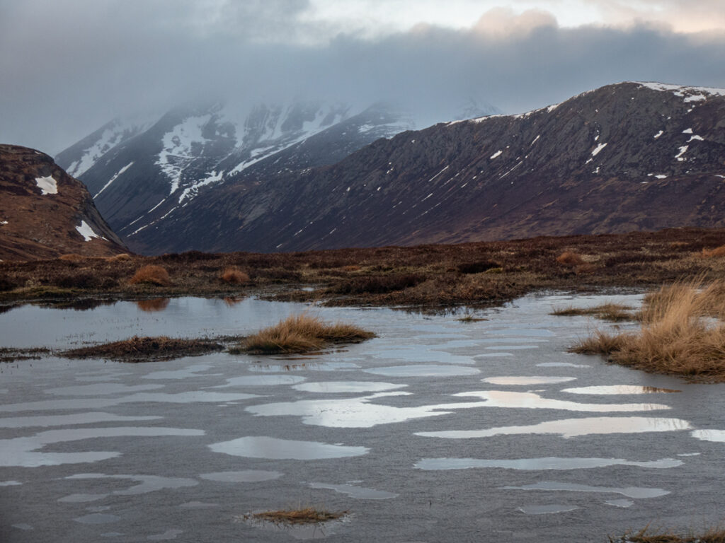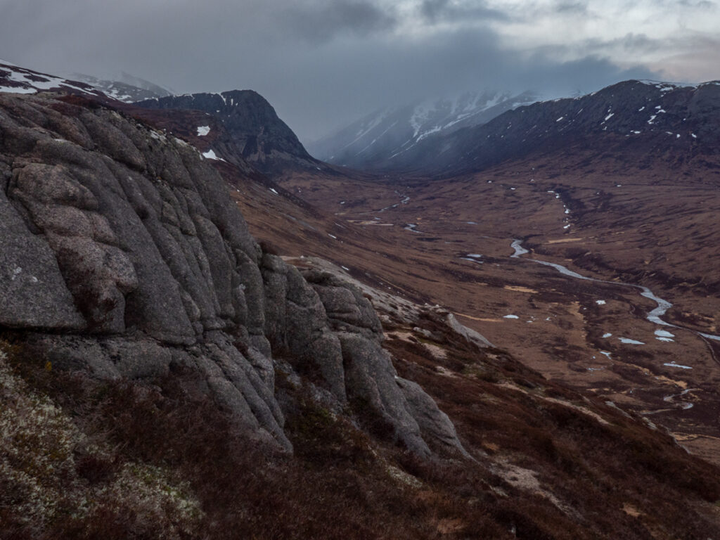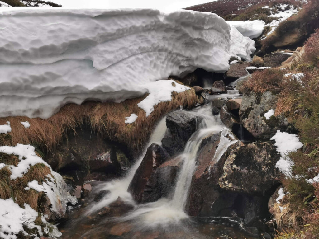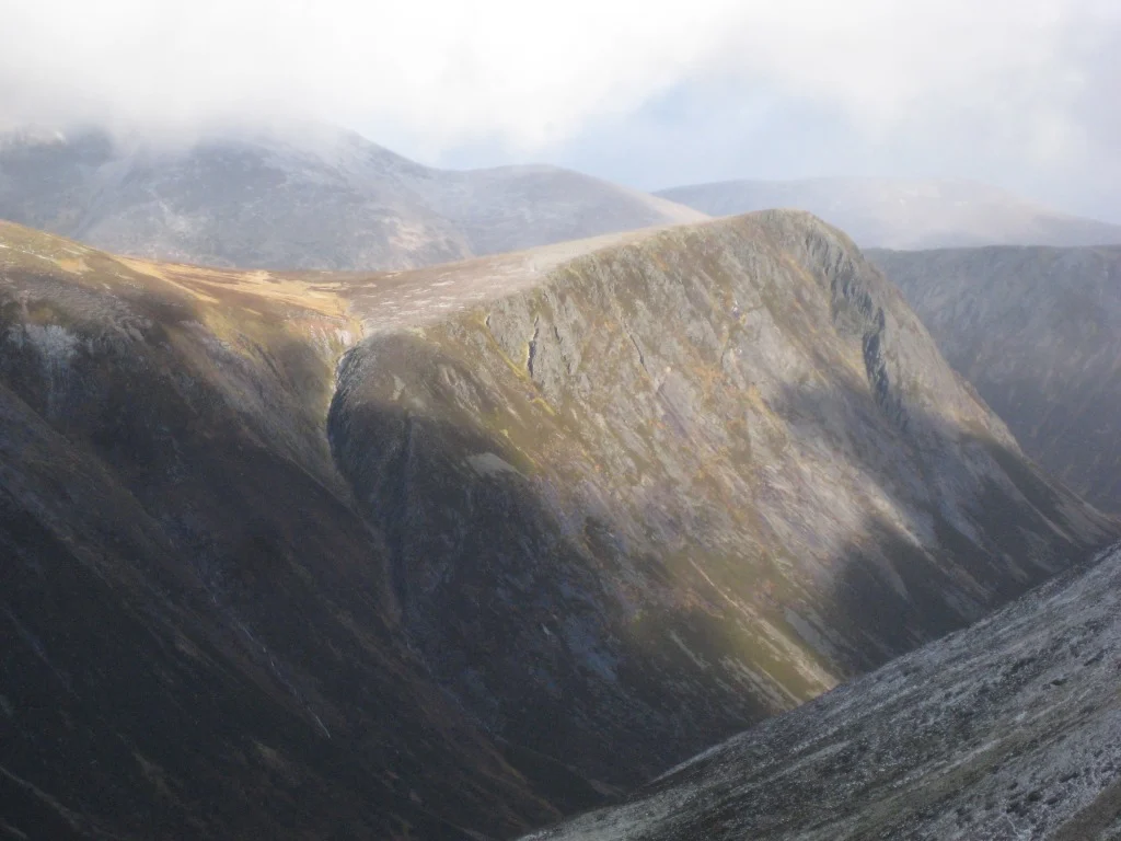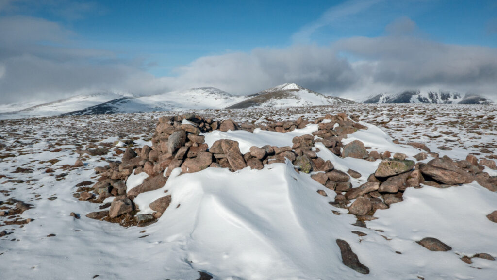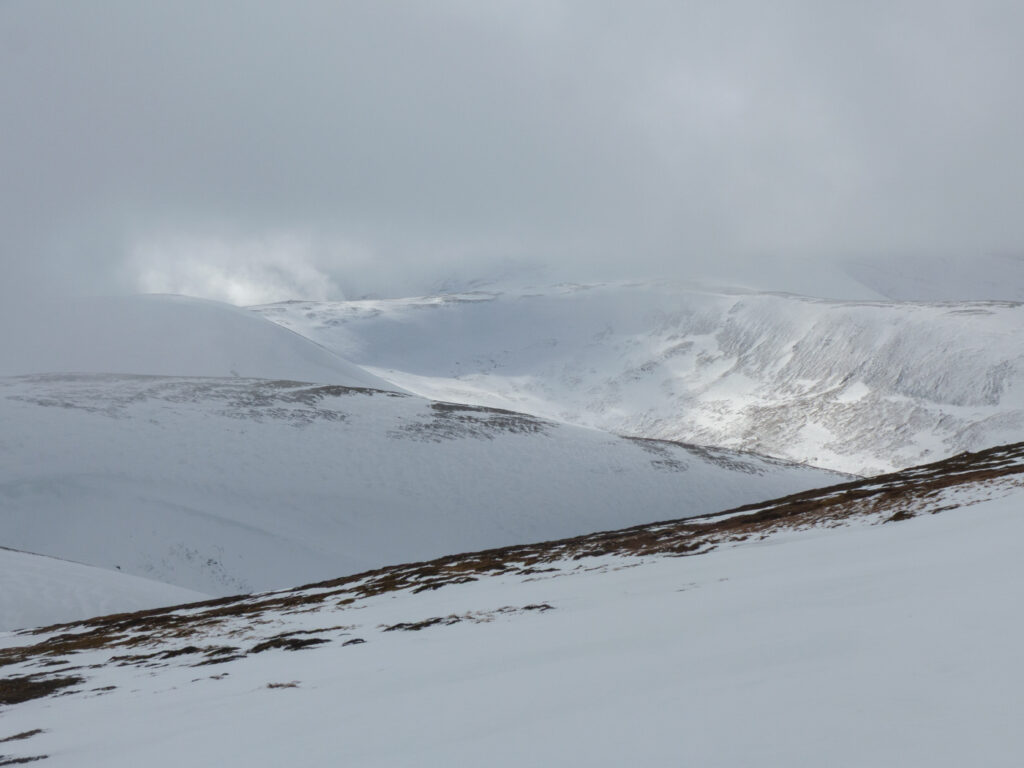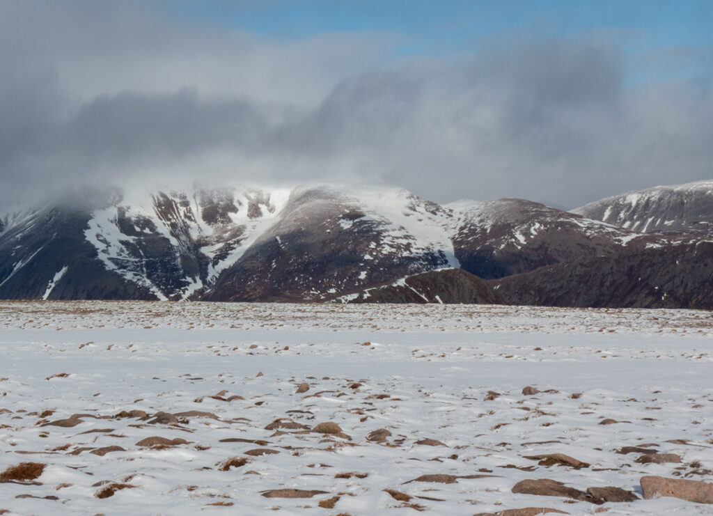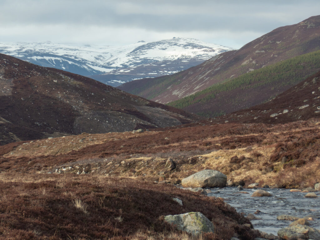 The austere dome of Beinn Bhrotain overlooks the foot of the Lairig Ghru, its broad shoulders sweeping out above Glen Dee with rugged views of Monadh Mor and The Devil’s Point. In spring, the upper slopes are often streaked with ribbons of lingering snow, gathered in ribbons and corries. Streams, waterfalls and slabbed rock faces punctuate it’s wider spaces. Within it’s realm lies Carn Cloich-mhuilinn, one of the munros that got away for the originator of the list.