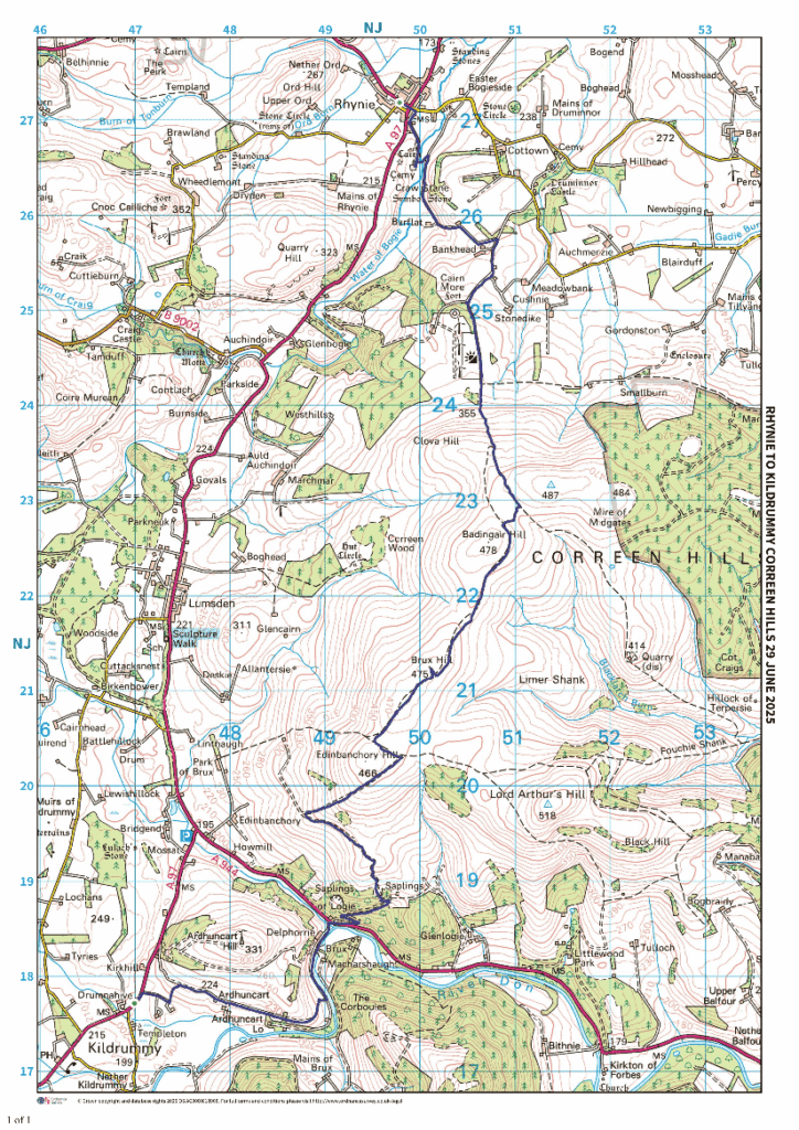 Overview A moderate hill walk, keeping at a steady pace, with a gradual climb of about three hours on tracks. The route heads south from Rhynie 180m, out of the Water of Bogie glen up onto the Correen Hills. We traverse over Badingair Hill 478m and Brux Hill 475m, and descend from