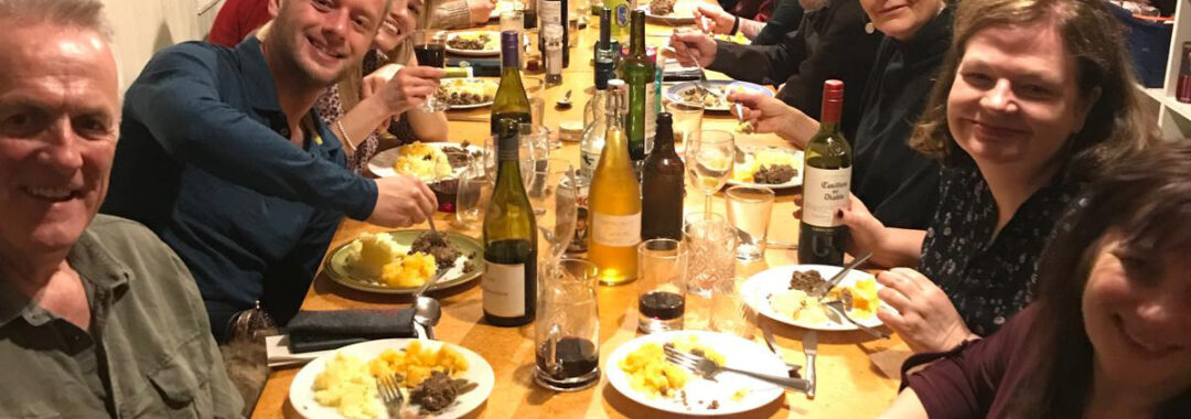 Safely back in our cosy cottage at sundown, the next wave of red and amber flowed forth – in wine, beer and whisky glasses, as we were fed and entertained in the traditions of a Burns night, with music (pipes, singing, fiddles, mandolins..), poetry, tales and banter into the wee hours of the night.