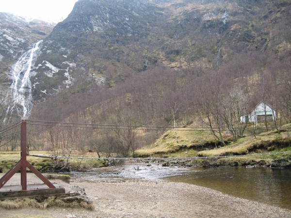 Steall waterfall, the JMCS hut and the wire bridge across to it.