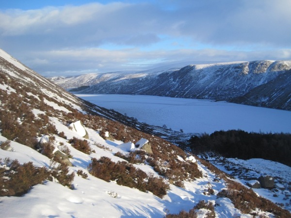 sunshine of, the also frozen, Loch Muick and its surrounds.